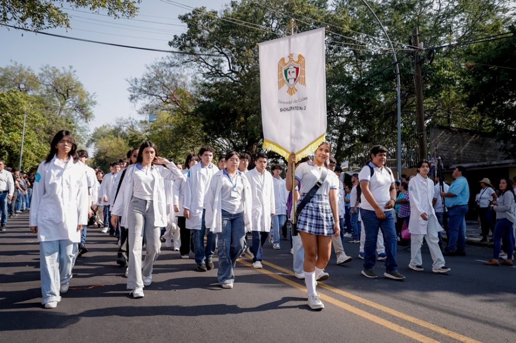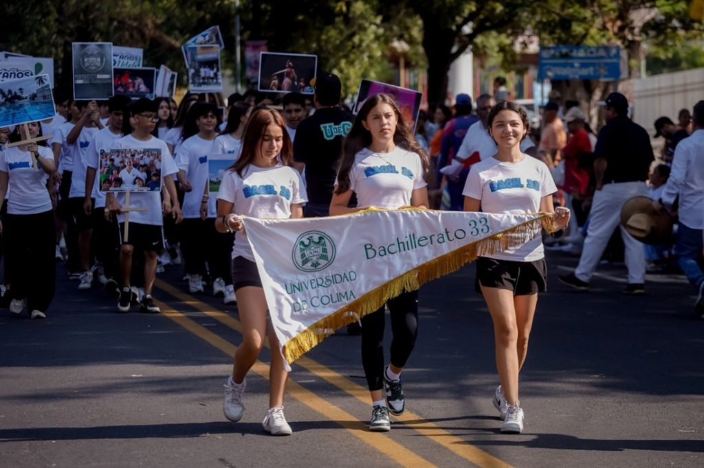 El recorrido de los universitarios inició con el bloque histórico, a cargo de estudiantes del Bachillerato 3, quienes portaron con solemnidad el Pabellón Institucional, el Pendón Universitario, los estandartes del 85 aniversario y una galería de fotografías que narran la evolución de la institución desde su fundación como Universidad Popular de Colima en 1940.