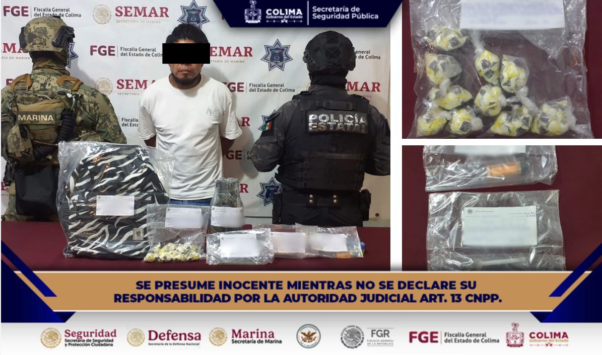 La Secretaría de Seguridad Pública (SSP) informó mediante un comunicado de prensa sobre la detención de un hombre al que le fueron aseguradas 200 dosis de sustancia granulada con características similares a la droga conocida como ice, esto durante los patrullajes que las corporaciones federales, estatales y municipales llevan a cabo en Villa de Álvarez.
