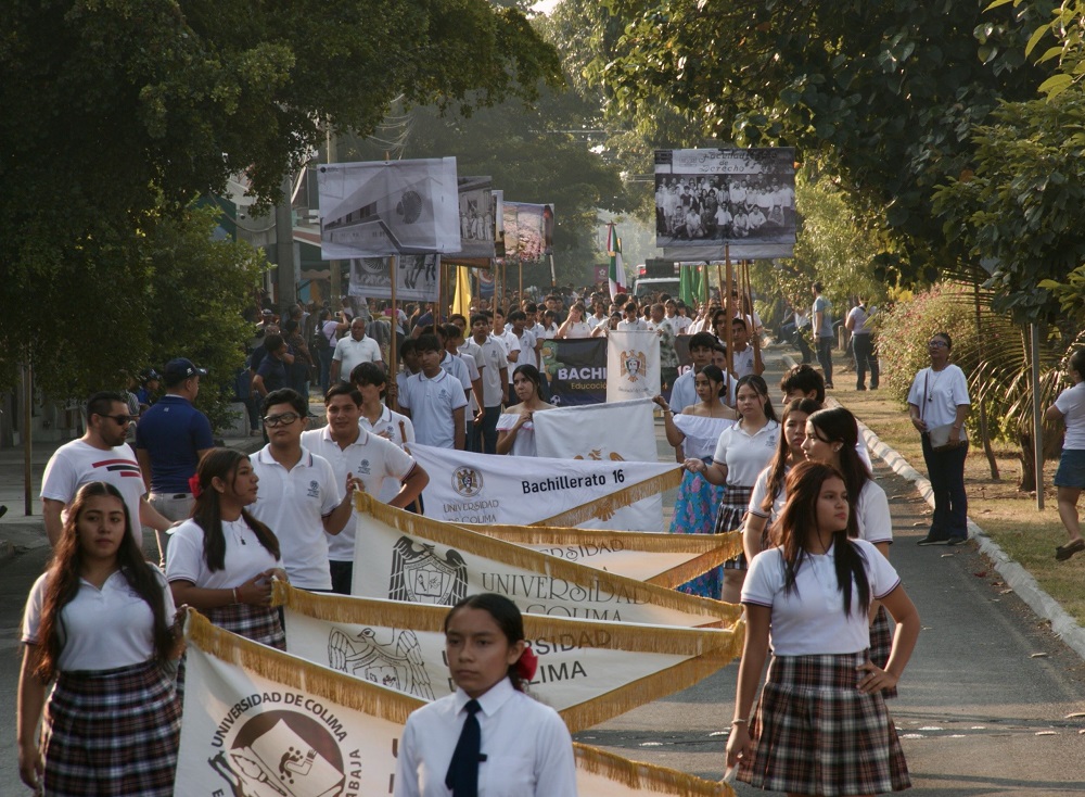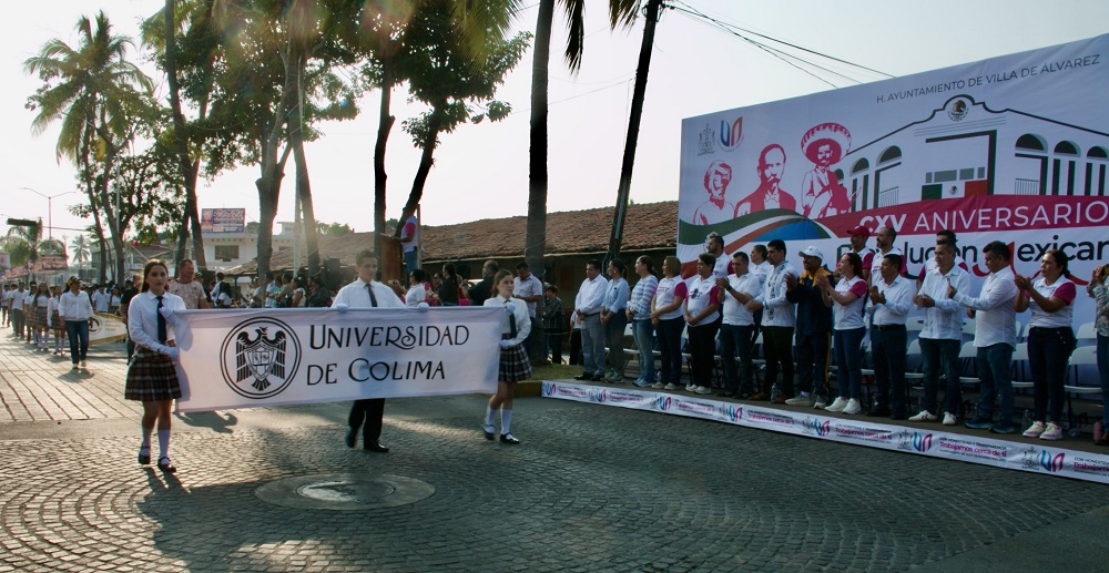 Este domingo 23 de noviembre, la Universidad de Colima se sumó al desfile cívico conmemorativo por el 115 aniversario de la Revolución Mexicana, realizado en las principales calles del centro de Villa de Álvarez, con un contingente cercano a los 250 participantes, integrado por estudiantes de los bachilleratos 4 y 6, así como personal de la Dirección General de Cultura Física y Deporte.