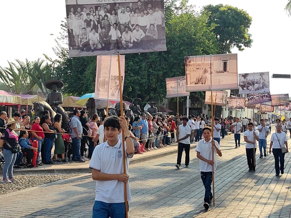El contingente universitario se presentó con un bloque histórico que incluyó pendones institucionales, estandartes del 85 aniversario de la Universidad y una línea visual sobre la evolución del escudo universitario, así como equipos deportivos representativos de ambos bachilleratos, en un despliegue colorido y artístico que evocó el espíritu de la Revolución Mexicana.