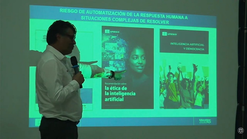 Una de las ideas clave de su charla fue la urgencia de integrar la innovación digital con sentido humano. El conferencista argumentó que la era digital ofrece herramientas poderosas para el aprendizaje, pero no reemplaza la dimensión humana de la educación. En sus palabras, “los dispositivos e infraestructuras son necesarios, pero la verdadera transformación ocurre cuando tecnologías y docentes se articular en función de valores, cultura, creatividad”. En ese sentido, dijo, la UNESCO impulsa marcos de política educativa que promueven el aprendizaje híbrido, la alfabetización digital crítica y el desarrollo de competencias para la vida.