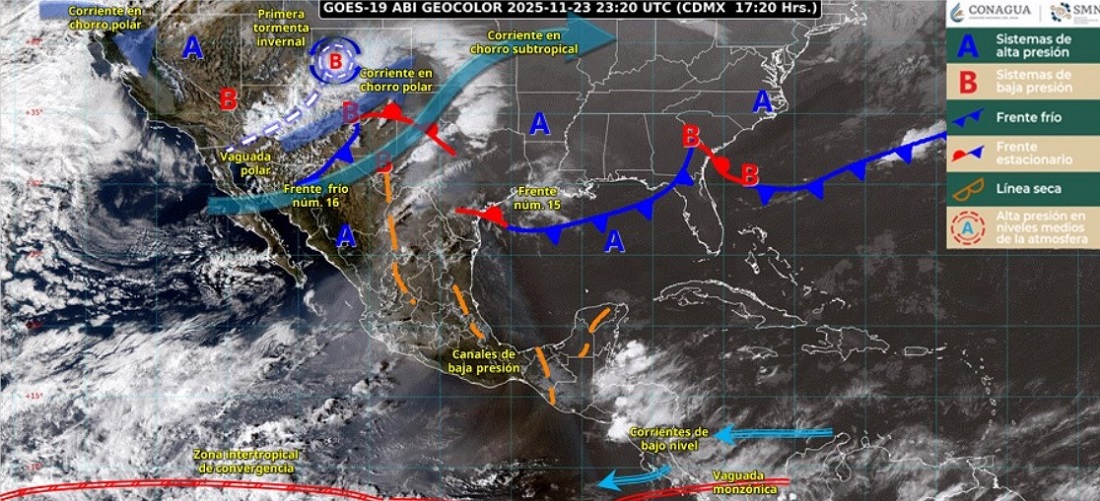 El SMN indicó que el lunes (24) prevé intervalos de chubascos (5 a 25 mm) en Chiapas, Campeche y Quintana Roo, y temperaturas mínimas de -10 a -5 grados Celsius con heladas durante la madrugada del martes (25) en zonas serranas de Chihuahua y Durango.