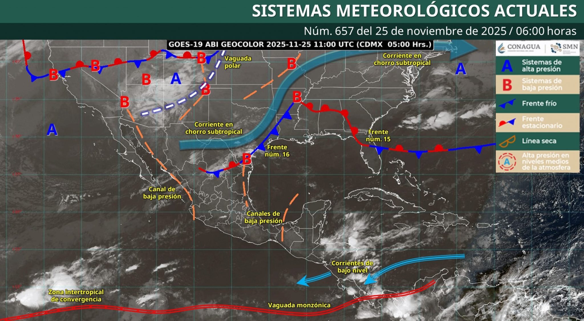 En el resto del país, el frente frío número 16 generará lluvias fuertes en el noreste de México, mientras que continuará el ambiente muy frío con heladas en zonas altas del norte y centro del territorio nacional.