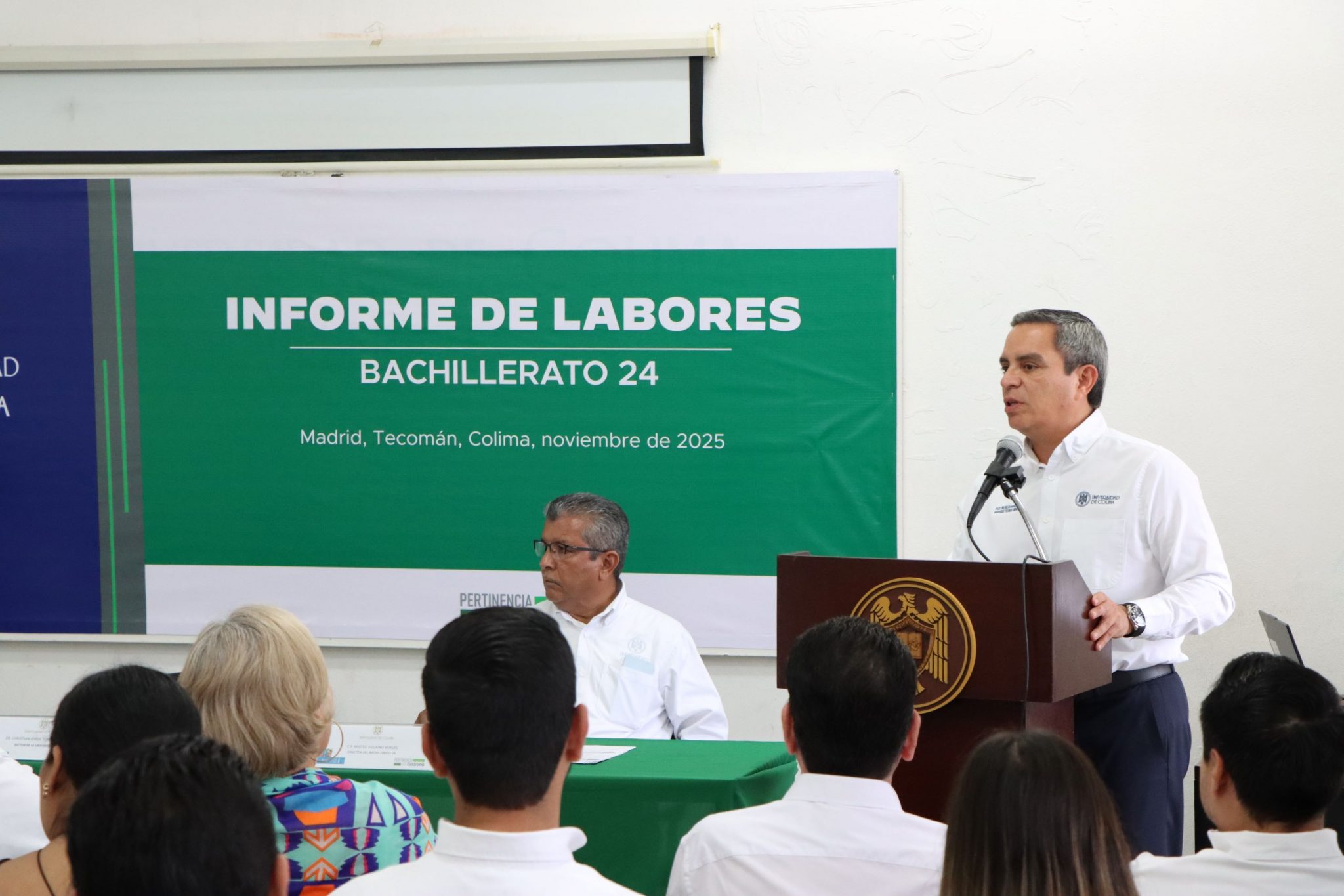 El Bachillerato 24 de la Universidad de Colima, ubicado en la comunidad de Madrid, realizó su ejercicio anual de rendición de cuentas, encabezado por su director, Aristeo Vizcaíno Vargas, ante directivos universitarios, personal docente, estudiantes y el rector Christian Jorge Torres Ortiz Zermeño, quien destacó la importancia de los planteles ubicados en zonas rurales y su impacto en el acceso a la educación.