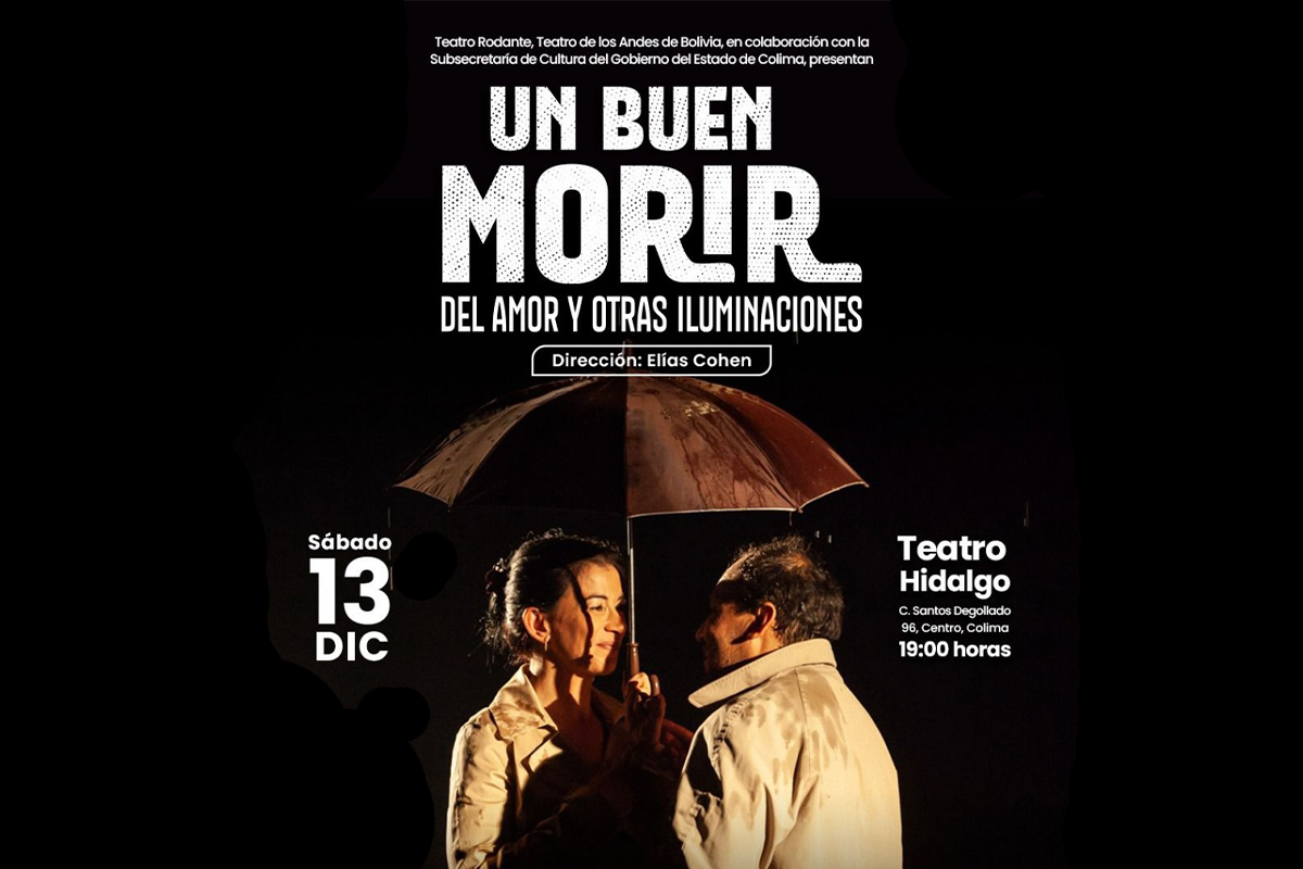 La Subsecretaría de Cultura, Teatro Rodante, y la compañía Teatro de Los Andes invitan al público colimense a disfrutar de la función especial de “Un buen morir: del amor y otras iluminaciones”, puesta en escena que llegará desde Bolivia, el sábado 13 de diciembre al Teatro Hidalgo, en el centro histórico de la ciudad capital del estado.