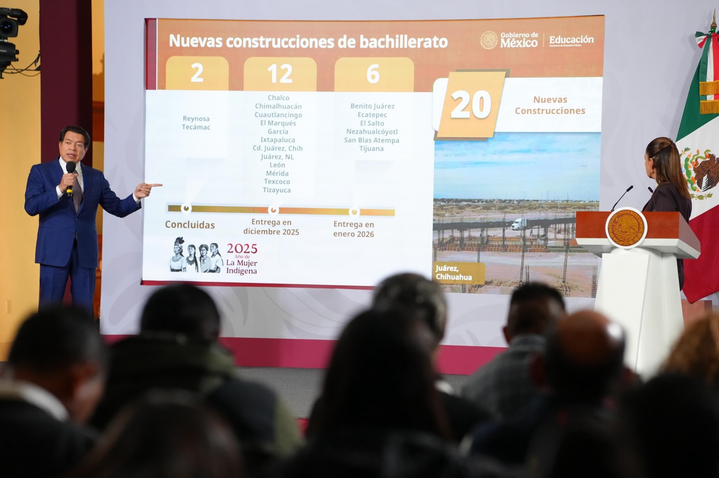 El secretario de Educación Pública, Mario Delgado Carrillo, detalló que, de las 88 acciones contempladas en el Plan Integral del Sistema Nacional del Bachillerato para este año, la Secretaría de Infraestructura, Comunicaciones y Transportes (SICT) está a cargo de 22 nuevos bachilleratos. De estos, ya concluyó la construcción de 2 planteles en Reynosa y Tecámac. Mientras que en diciembre se entregan en Chalco, Chimalhuacán, Cuautlancingo, El Marqués, García, Ixtapaluca, Ciudad Juárez, Chihuahua, León, Juárez (Nuevo León), Mérida, Texcoco y Tizayuca. Y en enero de 2026 se terminarán los ubicados en Benito Juárez, Ecatepec, El Salto, Nezahualcóyotl, San Blas Atempa y Tijuana.
