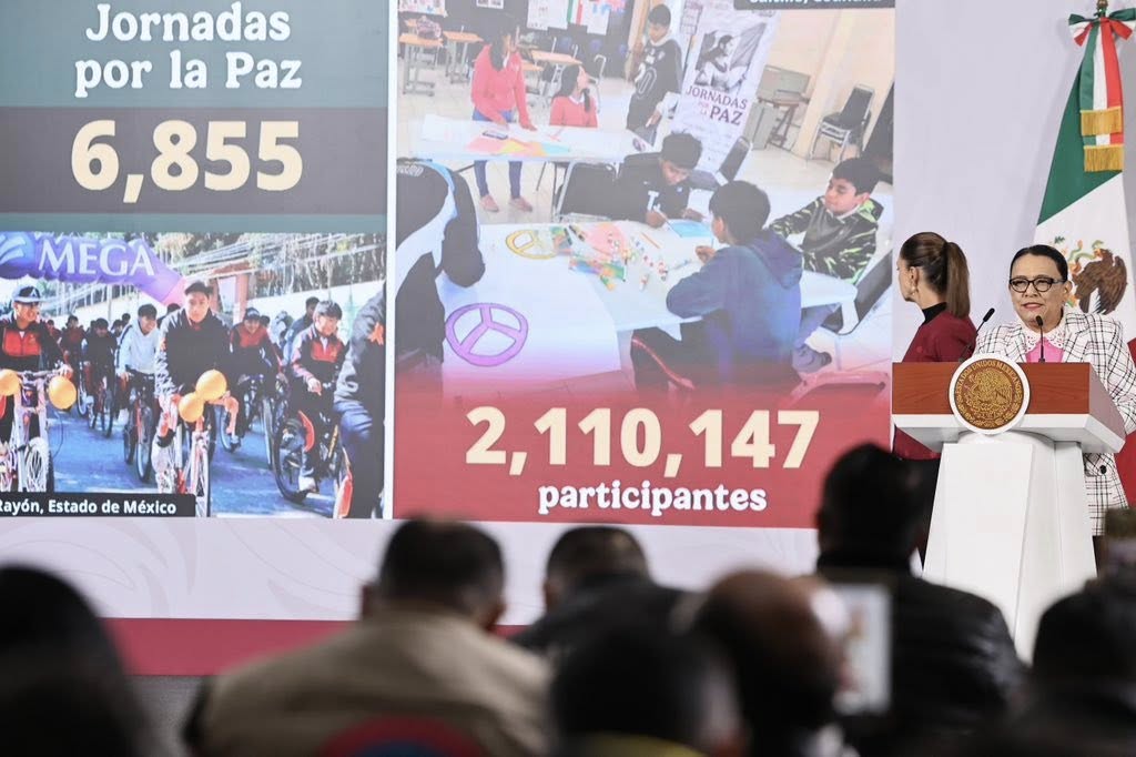 La secretaria de Gobernación, Rosa Icela Rodríguez Velázquez, informó que, como parte del eje de Atención a las Causas, en un año de trabajo se atendieron a 3 millones 69 mil 448 personas en 15 estados y 77 municipios, brindando 4 millones 689 mil 150 atenciones; se llevaron a cabo 404 Ferias de Paz, se conformaron 338 Comités de Paz y 32 Mesas de Paz estatales y 266 regionales, además de la recuperación de 306 espacios públicos. Señaló que también se realizaron 6,855 Jornadas por la Paz con la participación de 2 millones 110 mil personas y 64 Ferias de Jóvenes Emprendedores con la asistencia de 19,104 personas.
