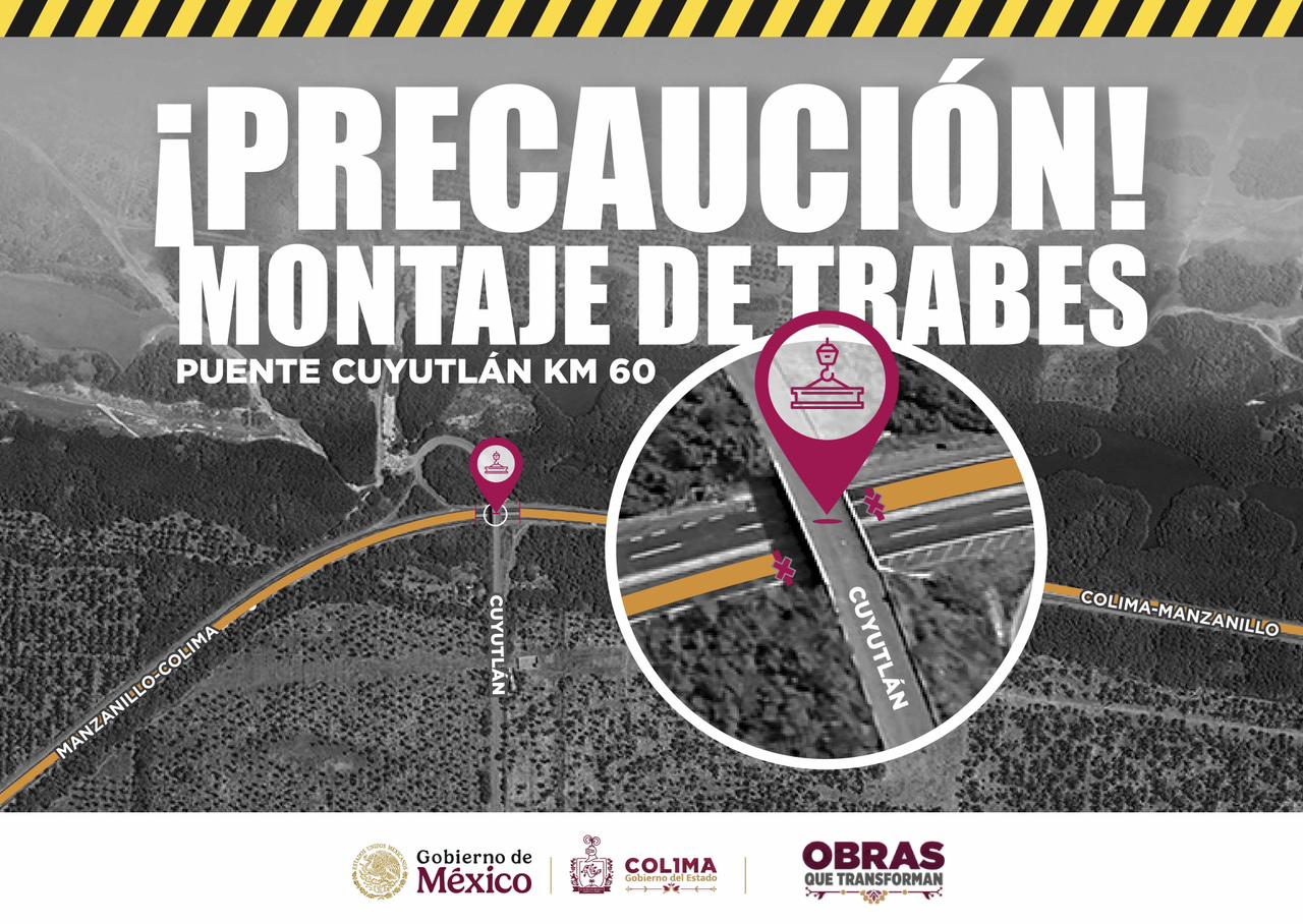 La Secretaría de Infraestructura, Desarrollo Urbano y Movilidad (Seidum) informó mediante un comunicado de prensa que este miércoles (10) se realizarán trabajos de montaje de trabes en el puente Cuyutlán, ubicado a la altura del kilómetro 60 de la autopista Colima-Manzanillo.