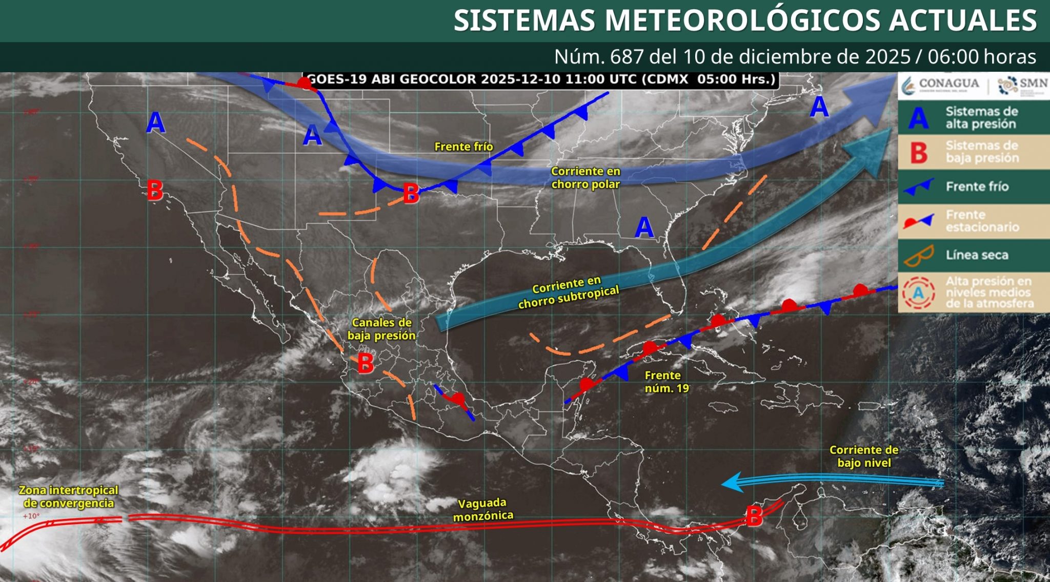 Este miércoles 10 de diciembre, Colima registrará lluvias aisladas y ambiente cálido a caluroso, de acuerdo con el pronóstico del Servicio Meteorológico Nacional (SMN). Aunque el frente frío número 19 permanecerá como estacionario sobre el oriente de la península de Yucatán, dejará de afectar al territorio nacional al final del día. En la región occidente, donde se ubica Colima, serán canales de baja presión y el ingreso de humedad del océano Pacífico los que favorecerán condiciones para lluvias dispersas.