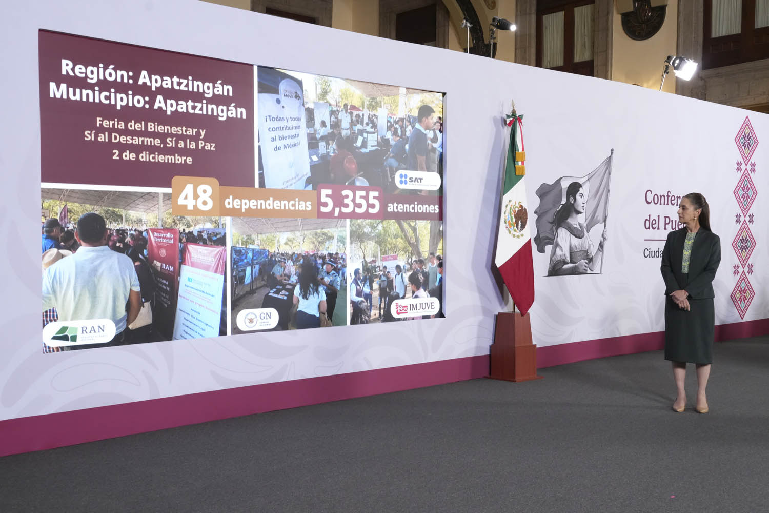 La secretaria de Gobernación, Rosa Isela Rodríguez Velázquez, informó que, durante diciembre se realizarán 13 Ferias del Bienestar, una en cada región de la entidad, de las que, del 9 de noviembre al 9 de diciembre, se han llevado a cabo 7 otorgando un total de 74,236 atenciones. Además, se implementarán cuatro jornadas de Sí al Desarme, Sí a la Paz, así como un Tianguis del Bienestar en las que participarán 53 dependencias del Gobierno de México, del Gobierno del estado y autoridades municipales.