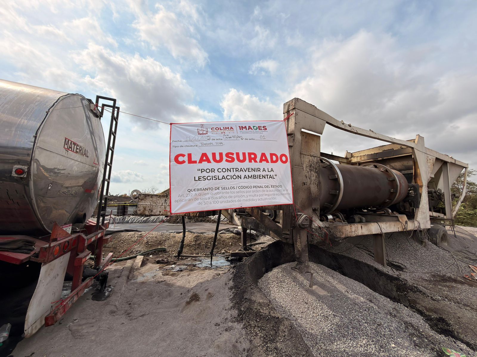 El Gobierno del estado de Colima, a través del Instituto para el Medio Ambiente y Desarrollo Sustentable (Imades), llevó a cabo la clausura total-temporal de las actividades en una planta de asfalto en el municipio de Manzanillo, debido a diversas irregularidades y al incumplimiento de la legislación ambiental vigente.