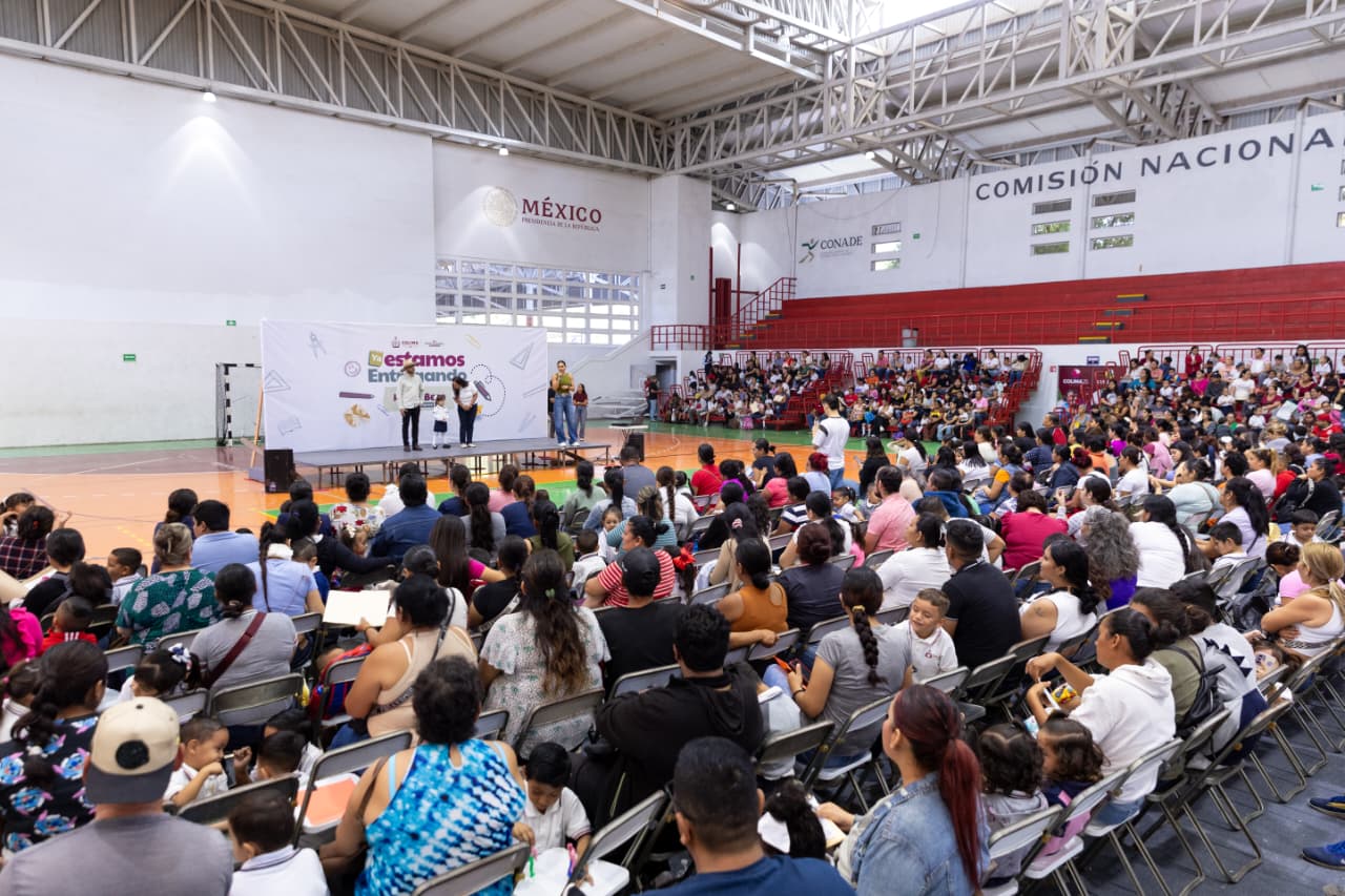 En el evento de la capital colimense, 1,596 alumnas y alumnos, acompañados de madres, padres o tutores, recibieron sus tarjetas, mientras que, de manera simultánea, en el municipio de Armería se entregaron otras 1,321 tarjetas a estudiantes de preescolar.