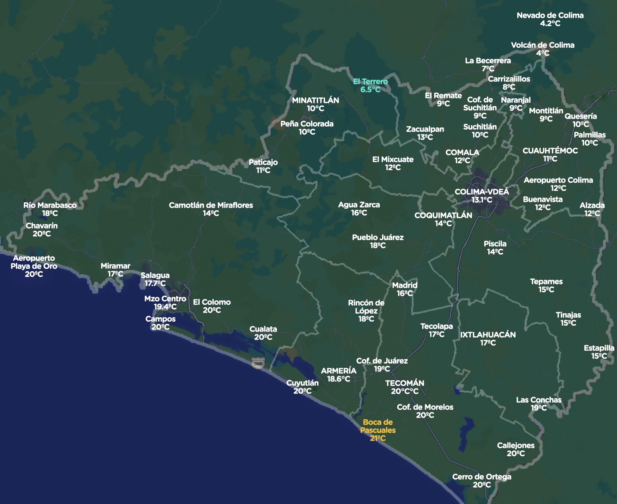 – Comala, que reportó 12°C, consolidándose como una de las cabeceras municipales más frías de la mañana.