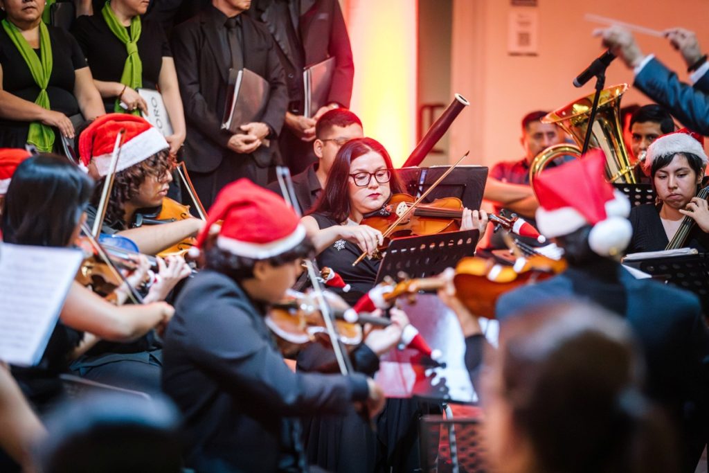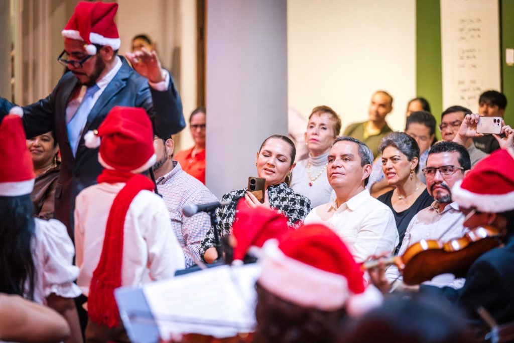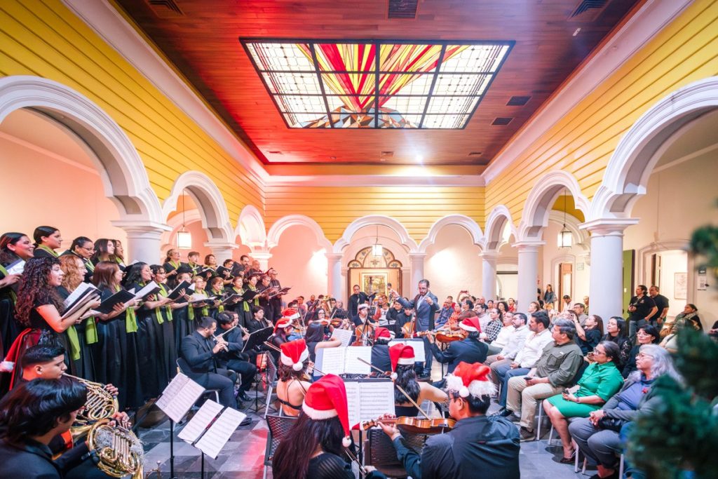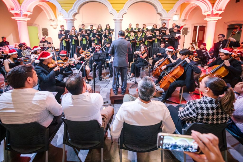 Para cerrar las actividades artísticas universitarias de este 2025, se llevó a cabo en la Pinacoteca Universitaria, el concierto “A Christmas Festival”, donde la Orquesta Sinfónica y el Coro de la Universidad de Colima, bajo la dirección del maestro José Antonio Frausto Zamora, ofrecieron un programa con temas de compositores como Wolfgang Amadeus Mozart, George Frederic Haendel, John Williams y Agustín Lara, en un acto que contó con la presencia del Rector de nuestra Máxima Casa de Estudios, Christian Jorge Torres Ortiz Zermeño.