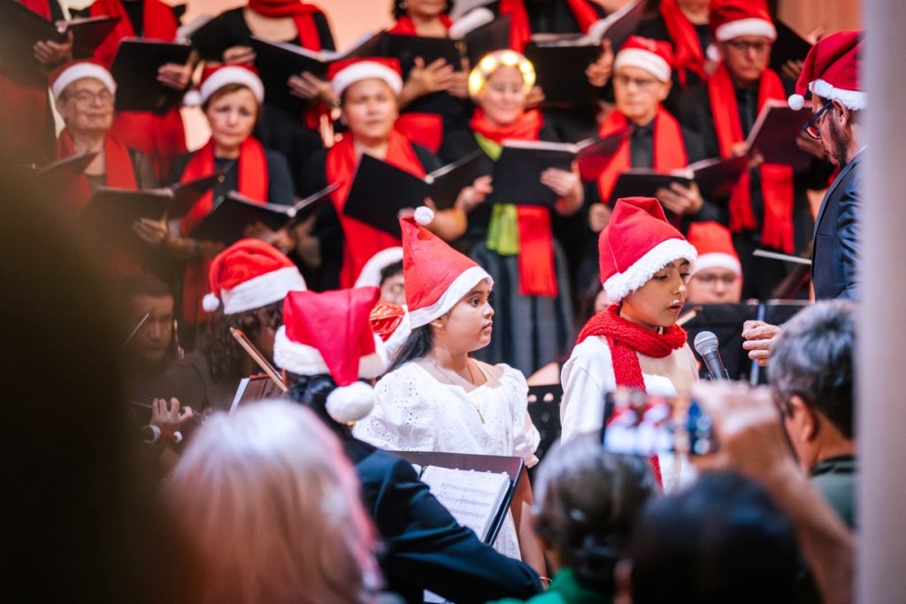 A continuación, las notas de la orquesta y las voces del coro dieron vida a Gloria, de la Misa de Coronación en Do mayor, KV 317 de W. A. Mozart, conduciendo al público a un momento de solemnidad que muestra la profunda espiritualidad del compositor austriaco. Momentos después se escuchó en el recinto Cantate Domino, en la cual el compositor contemporáneo Valentino Miserachs combina en su lenguaje musical elementos de la tradición coral con una escritura moderna, dinámica y llena de vitalidad.