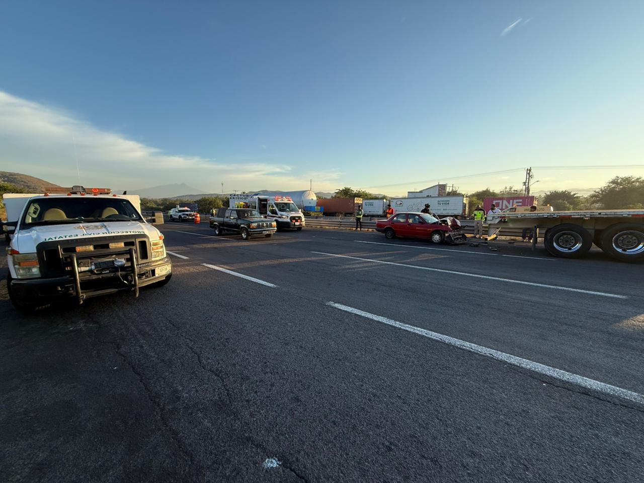 La Unidad Estatal de Protección Civil (UEPC) del Gobierno del estado informa en un comunicado de prensa que, la mañana de este miércoles 14 de enero se registró un accidente sobre la autopista Colima–Manzanillo, a la altura de la localidad Los Asmoles, en el sentido hacia la capital del estado, en el que estuvieron involucrados un automóvil Nissan Tsuru y un tráiler.