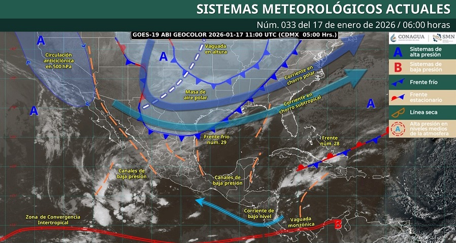 Para este sábado 17 de enero, el Servicio Meteorológico Nacional (SMN) pronostica intervalos de chubascos (de 5 a 25 mm) en Colima, acompañados de descargas eléctricas y posible caída de granizo, debido al persistente ingreso de humedad del océano Pacífico y a la inestabilidad atmosférica que afecta al occidente del país. Estas condiciones se presentarán a lo largo del día, con cielo de medio nublado a nublado en la región.