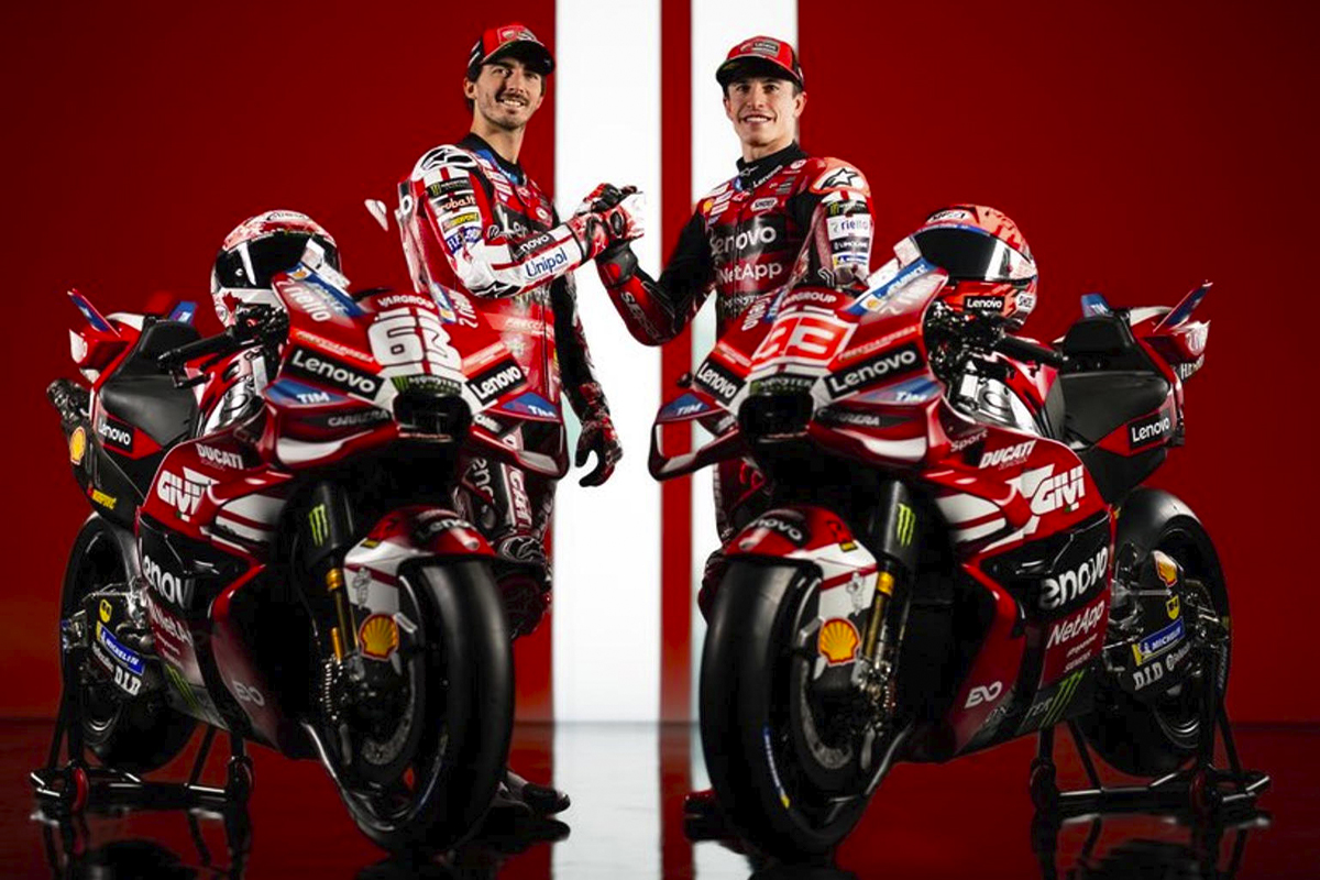 Fueron Márquez y Bagnaia los encargados de revelar el nuevo diseño por el que apuesta Ducati y que cuenta con tecnología de inteligencia artificial de la marca colaboradora del equipo, Lenovo.
