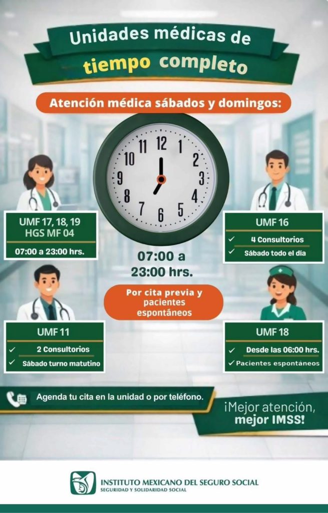 El Instituto exhorta a la población derechohabiente a acudir a su Unidad de Medicina Familiar correspondiente y a hacer uso responsable de los servicios disponibles durante los fines de semana, con el objetivo de cuidar su salud y la de sus familias.