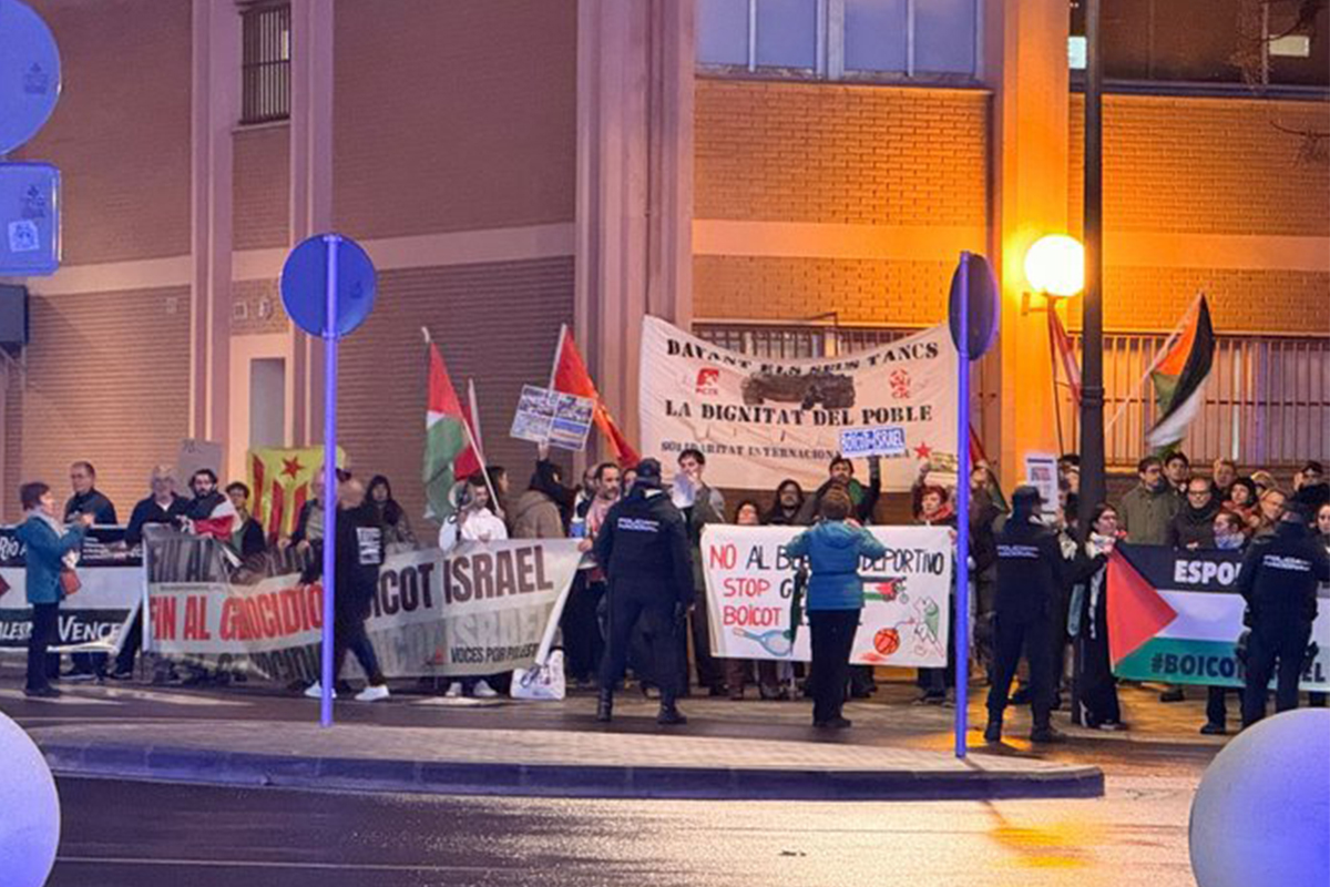 Cerca de 150 personas se concentraron frente al pabellón Roig Arena, donde el Valencia Basket y el Maccabi Tel Aviv se enfrentan en un partido de la Euroliga, para pedir la expulsión de Israel de las competencias deportivas europeas por entender como “genocida” su actuación en Palestina.