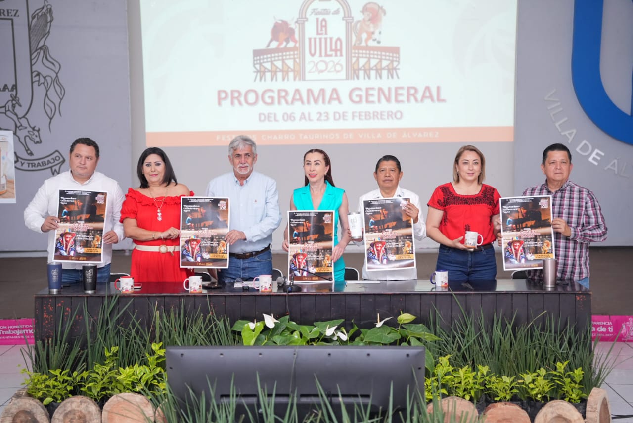 La alcaldesa de Villa de Álvarez, Esther Gutiérrez Andrade, presentó el Programa General de los Festejos Charrotaurinos Villa de Álvarez 2026, que contempla 14 cabalgatas, 11 toros de once, 11 recibimientos, 12 jaripeos vespertinos y 2 nocturnos, 3 espectáculos con artistas de talla nacional e internacional, así como 2 corridas formales.