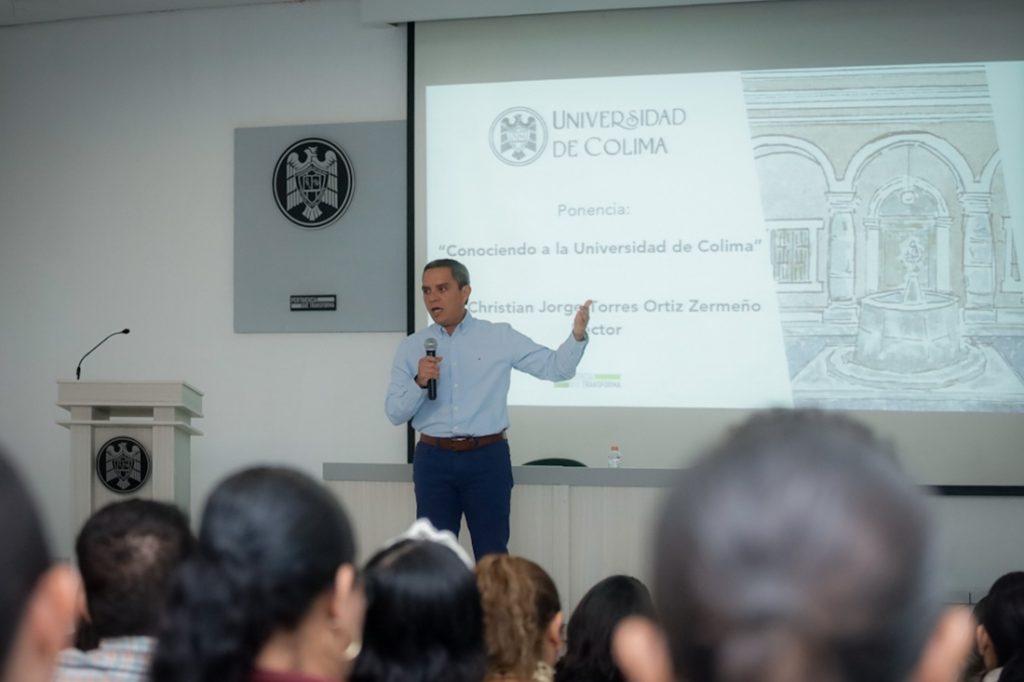 En una charla que dio a un grupo de universitarios reunido en el auditorio de la Facultad de Enfermería del Campus Central, el Rector de la Universidad de Colima (UdeC), Christian Jorge Torres Ortiz Zermeño, habló de los objetivos y funciones esenciales de esta Casa de Estudios y compartió parte de su trayectoria académica y administrativa dentro de la institución, que inició como profesor por asignatura y continuó en distintos cargos directivos, hasta asumir la Rectoría en 2021.