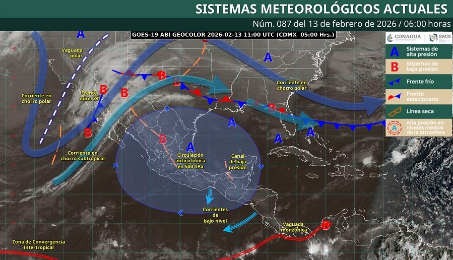 En contraste, en otras entidades del país persistirán efectos asociados al sistema frontal y a la interacción con la vaguada polar y las corrientes en chorro, así como un evento de “surada” con rachas fuertes en estados del noreste y el Golfo de México.