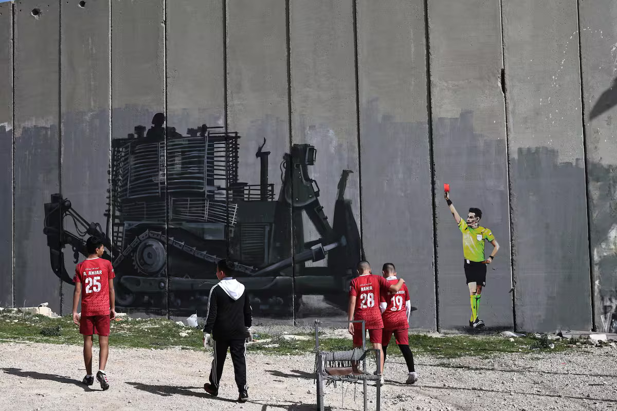 El campo de futbol del campamento de refugiados palestinos de Aida (en Belén, Cisjordania) estrenó en las últimas horas un nuevo mural, en el que puede verse a un árbitro con el parche de la UEFA en su camiseta mostrando tarjeta roja a una excavadora del Ejército israelí.