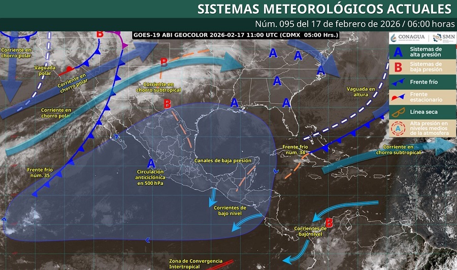 Este martes 17 de febrero, el frente frío número 35 se desplazará sobre el noroeste y norte del país, donde provocará rachas de viento fuertes a muy fuertes, descenso de temperatura, chubascos y lluvias en entidades como Baja California y Sonora, además de condiciones para la caída de nieve o aguanieve en la sierra norte de Baja California y lluvia engelante en el norte de Sonora.