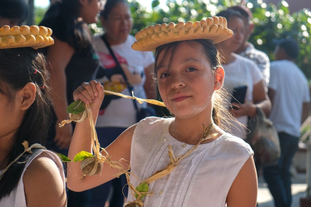 Uno de los elementos más distintivos del ritual es el pinole, mezcla derivada del maíz que los participantes utilizan para cubrir su rostro. El gesto remite a la tierra, al sustento ancestral y al vínculo con el ciclo agrícola. Más tarde, los paspaques son “coronados” con pan ceremonial y con un rosario de suales, elaborado por la alguacila con el apoyo de estudiantes de la comunidad.