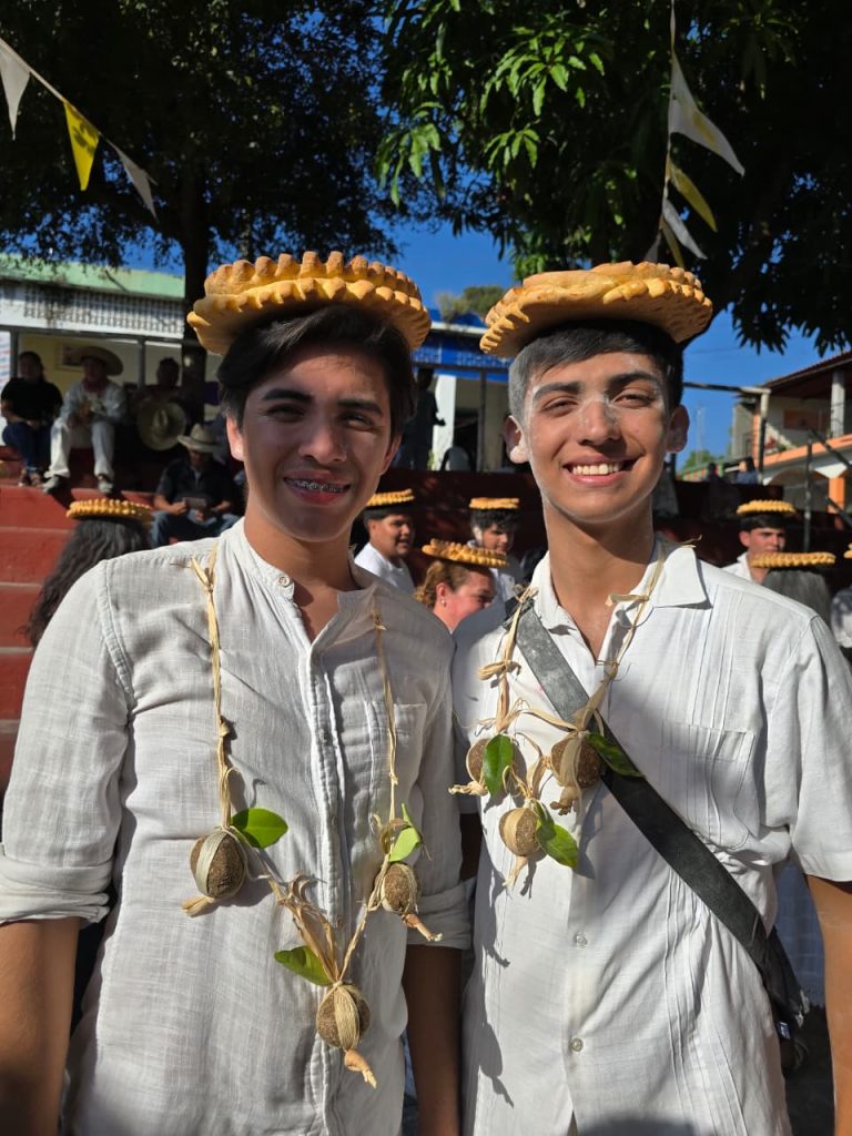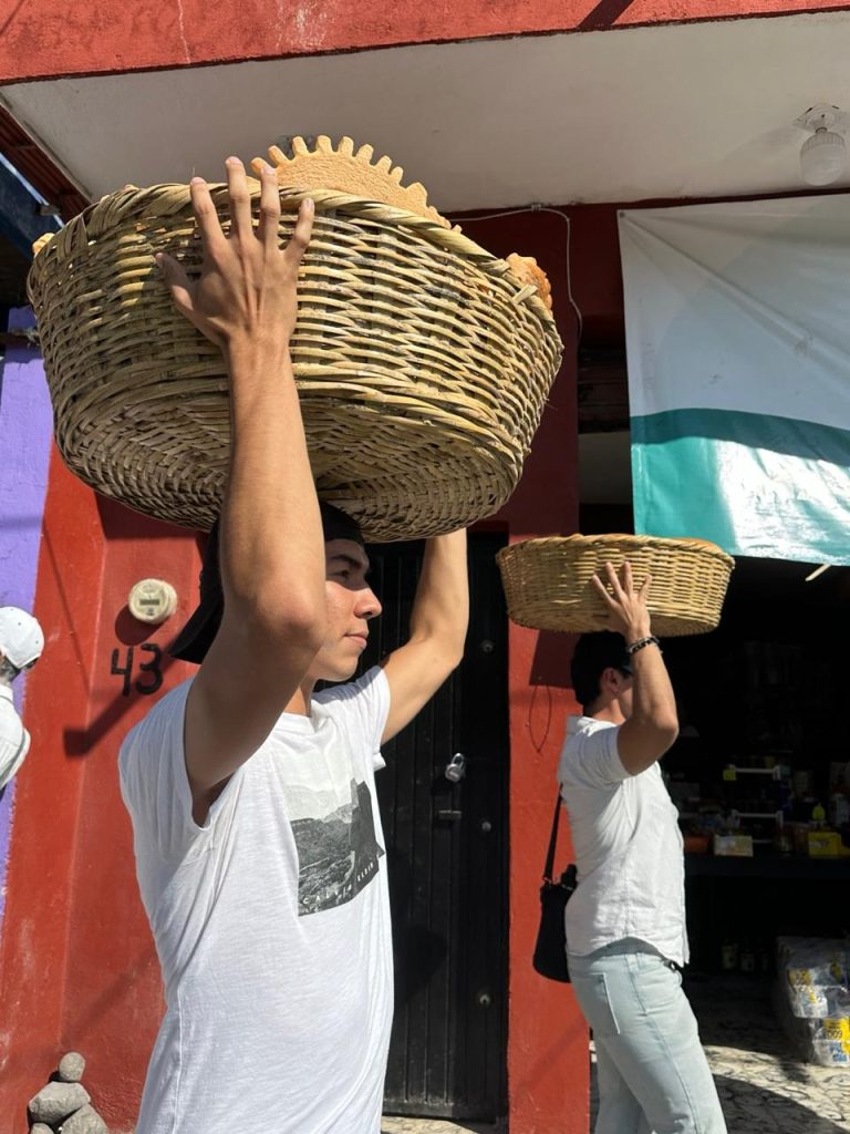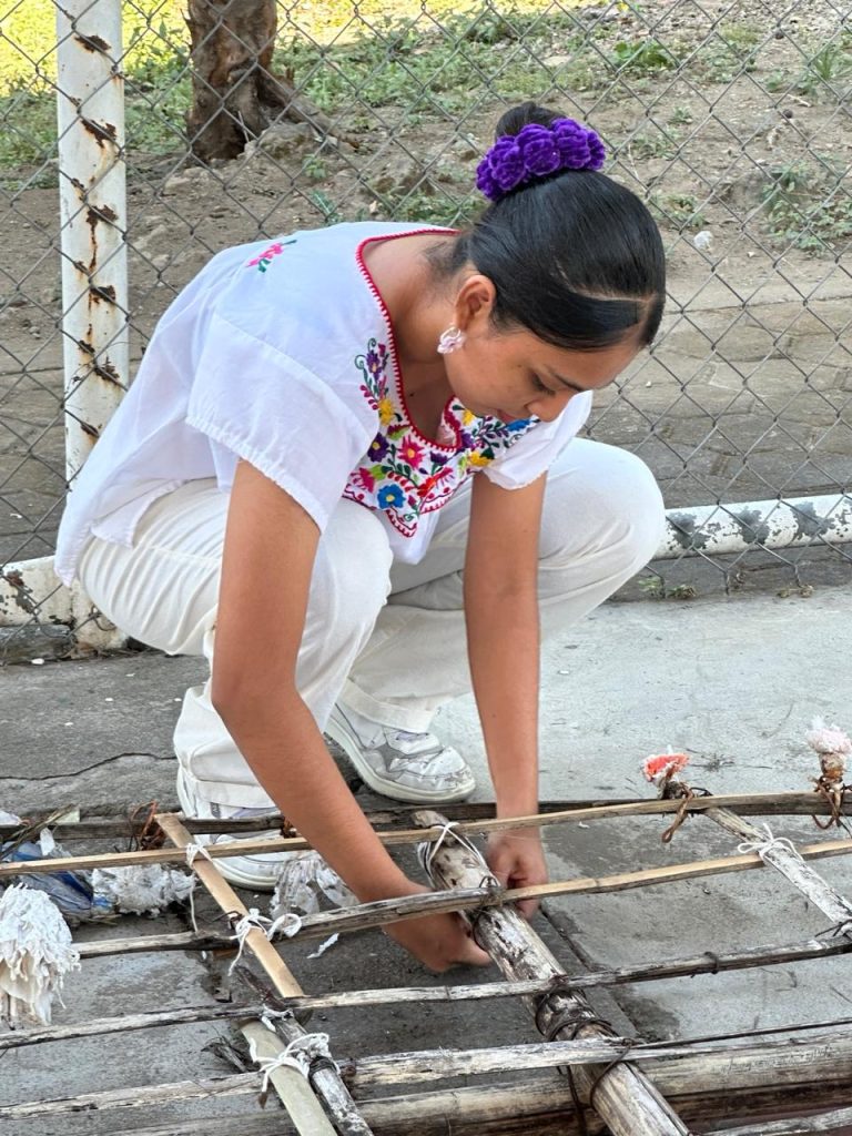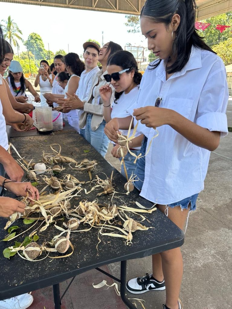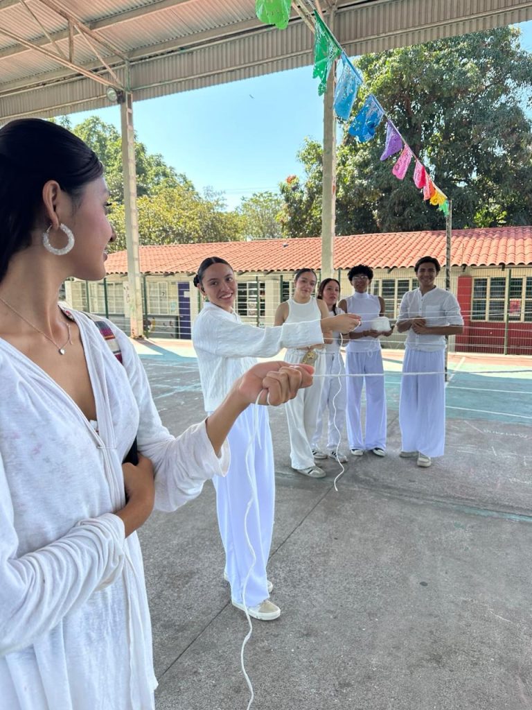 Durante su estancia, las y los estudiantes colaboraron en diversas actividades asignadas por las autoridades festivas. Participaron en la elaboración de elementos simbólicos como los “zuales” (bolas de maíz con piloncillo), así como en la preparación del arco o retablo donde se colocan imágenes religiosas y flores de papel crepé que forman parte de la ornamentación tradicional.
