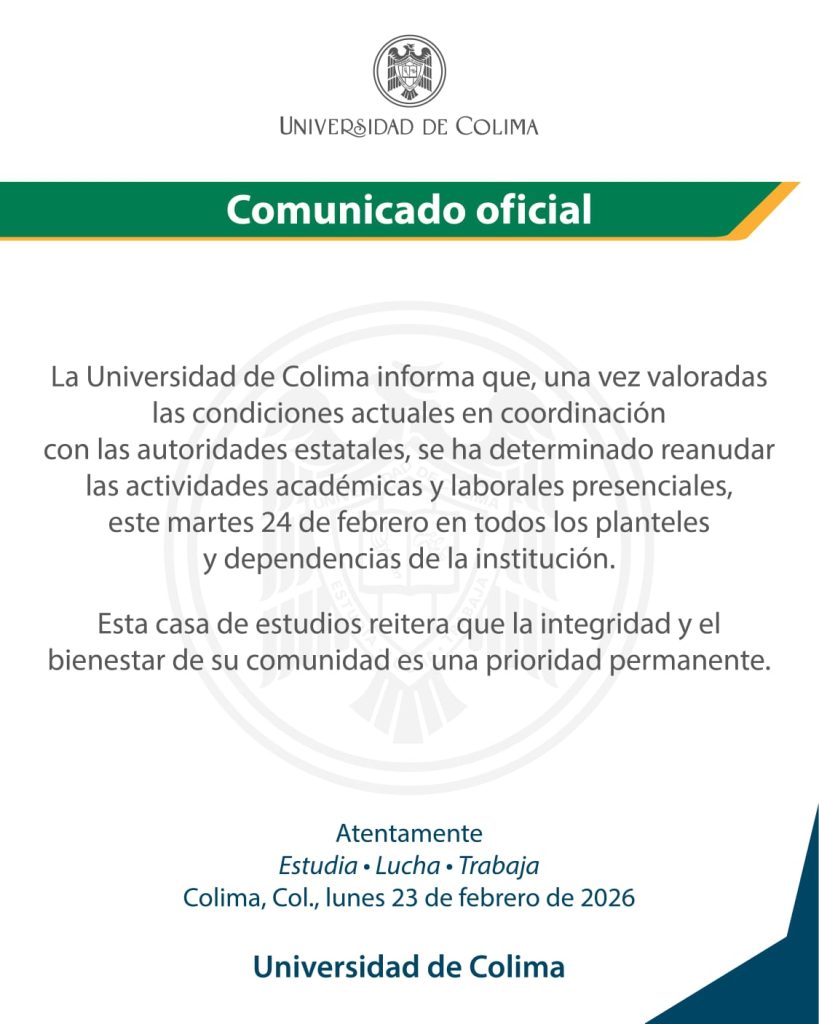 La Universidad de Colima informó en un comunivcado que, tras valorar las condiciones actuales en coordinación con las autoridades estatales, se determinó reanudar las actividades académicas y laborales presenciales este martes 24 de febrero en todos los planteles y dependencias de la institución.
