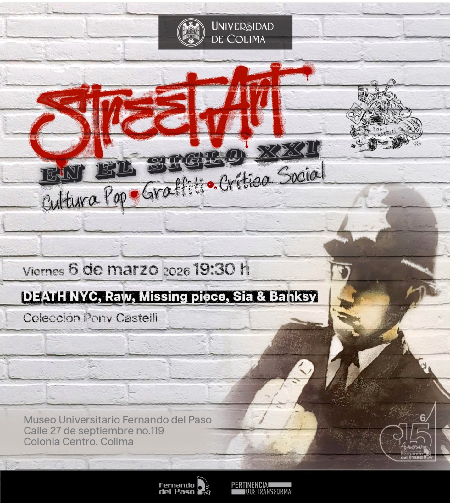 Con el propósito de iniciar la celebración de sus primeros 15 años de vida, el Museo Universitario “Fernando del Paso” de la Universidad de Colima invita a la apertura de la exposición “Street art en el siglo XXI. Cultura pop, grafiti y crítica social”, un proyecto con enfoque interpretativo y didáctico que traza la evolución del arte urbano contemporáneo desde movimientos emblemáticos como el Pop art y el Street art de las décadas de 1960 y 1970.