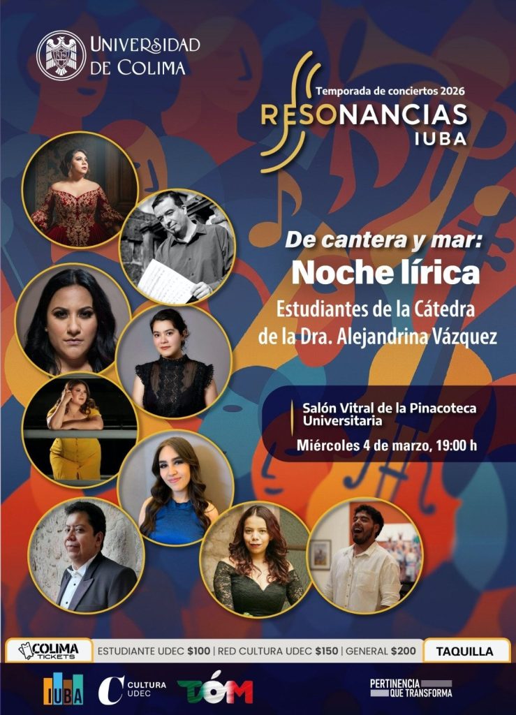 Este miércoles 4 de marzo continúa el programa cultural “Resonancias 2026” del Instituto Universitario de Bellas Artes (IUBA) de la Universidad de Colima, con el concierto “De cantera y mar: Noche Lírica”, a cargo de estudiantes de la Cátedra de la doctora Alejandrina Vázquez Ramírez. El evento se realizará a las 7 de la tarde en la Sala del Vitral de la Pinacoteca Universitaria.