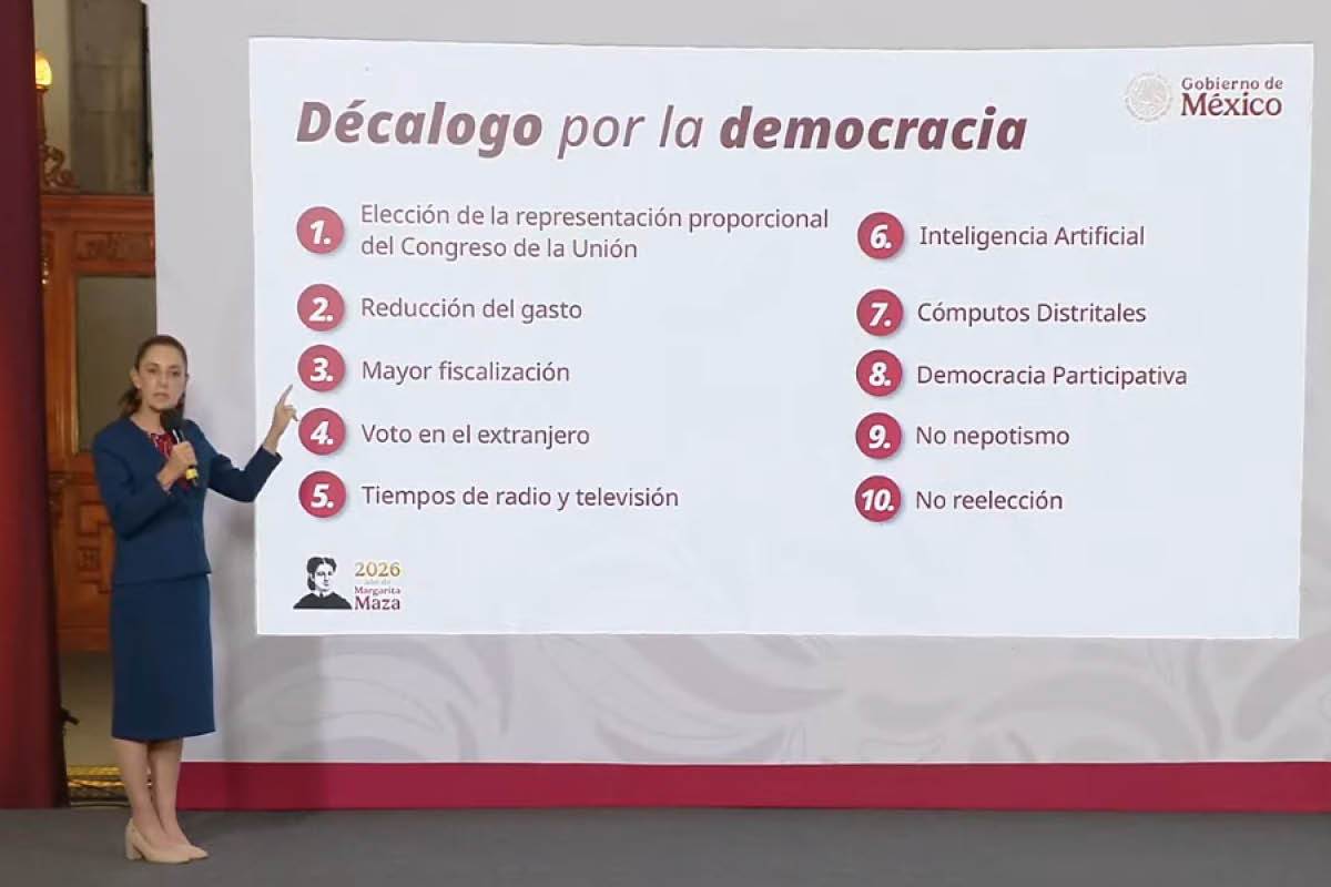 La Presidenta de México, Claudia Sheinbaum, señaló que enviará este miércoles su propuesta de reforma electoral al Congreso, a la que denominó “Decálogo por la democracia”, con 10 cambios constitucionales que incluyen modificar el sistema de representación proporcional, reducir el financiamiento electoral y prohibir la reelección inmediata a partir de 2030.