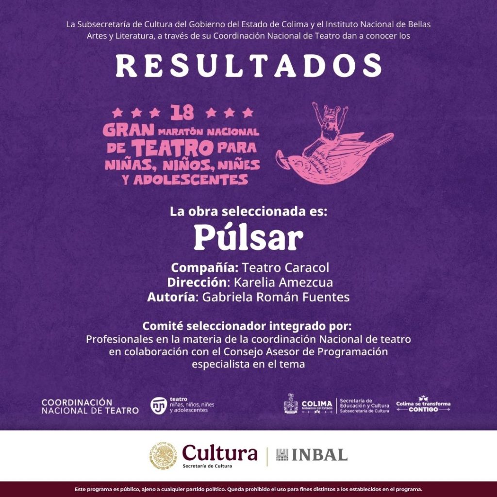 La Subsecretaría de Cultura del Gobierno del estado de Colima, en conjunto con el Instituto Nacional de Bellas Artes y Literatura (INBAL), publicaron los resultados de la convocatoria para integrar la programación del 18° Gran Maratón Nacional de Teatro para Infancias y Juventudes, donde la Compañía de Teatro Caracol resultó seleccionada con su obra “Púlsar” para ser parte de la cartelera que se desarrollará de manera simultánea en distintos estados de la República Mexicana el 21 y 22 de marzo, para celebrar el Día Mundial del Teatro para Infancias y Juventudes.