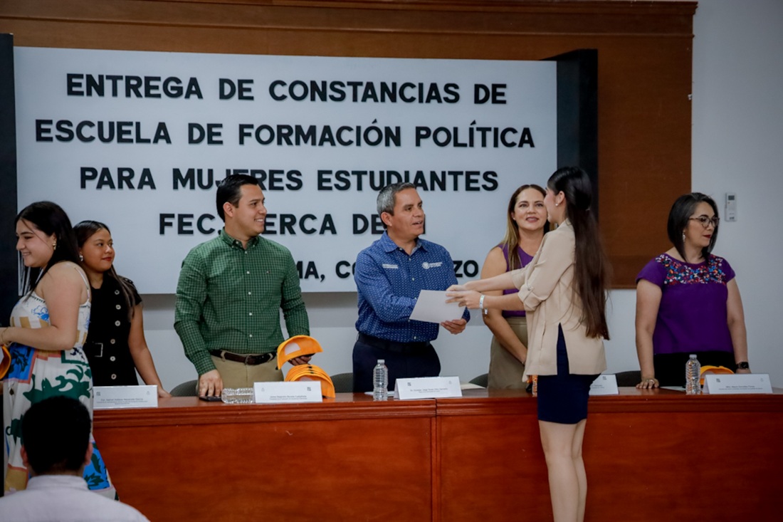 Christian Jorge Torres Ortiz Zermeño, Rector de la Universidad de Colima (UdeC), entregó las constancias que acreditan a las 40 mujeres estudiantes por su participación en la Escuela de Formación Política para Mujeres Estudiantes, la cual tiene como objetivo fortalecer el liderazgo, la participación y formación política de estudiantes de nivel medio superior y superior de la Máxima Casa de Estudios. El evento fue celebrado en el auditorio de la Federación de Estudiantes Colimenses (FEC).