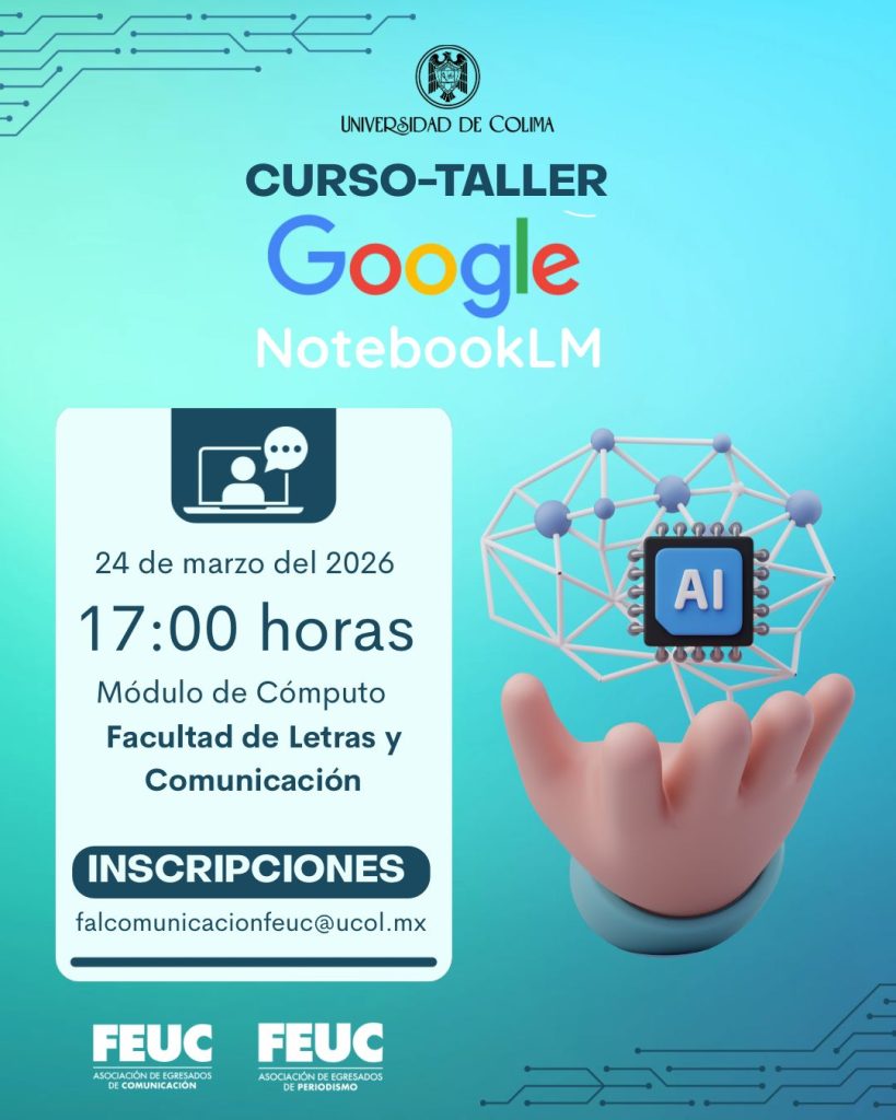 Con el objetivo de fortalecer las competencias digitales y el uso de herramientas de inteligencia artificial en el ámbito académico y profesional, las Asociaciones de Egresados de la Licenciatura en Comunicación y de la Licenciatura en Periodismo de la Universidad de Colima (UdeC), en conjunto con la Facultad de Letras y Comunicación (Falcom), convocan al curso-taller Google NotebookLM.