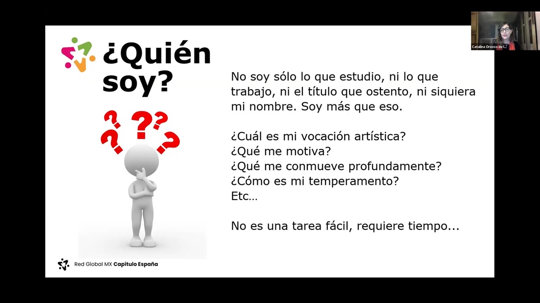 En el ámbito artístico, dijo Catalina Orozco de la Torre, siempre surge la pregunta: “¿Quién soy?”, y aunque pareciera un simple cuestionamiento, “la respuesta va más allá de una profesión o disciplina; no basta con decir ‘soy pintora o artista’; la verdadera vocación implica un proceso constante de introspección: identificar qué obras conmueven, qué técnicas atraen y qué motivaciones impulsan la creación”.