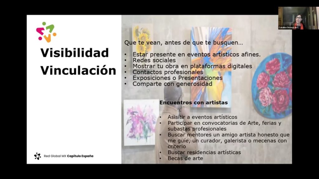 Por otra parte, dijo que el desarrollo artístico requiere organización, aprendizaje continuo y redes de apoyo, incluso en actividades creativas. “Me refiero a la red de apoyo, que incluye familia, amigos, compañeros artistas, asociaciones profesionales y mentores. Cuando vas a exponer y te encuentras a tus 10 amigos, te sientes acompañada, por eso son tan importantes las redes de apoyo”.