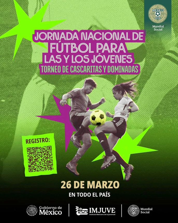 El próximo 26 de marzo, canchas, parques y espacios deportivos de todo el país se llenarán de actividad con la “Jornada Nacional de Futbol para las y los Jóvenes: Torneo de Cascaritas y Dominadas”, una iniciativa del Gobierno de México, a través del Instituto Mexicano de la Juventud (Imjuve).
