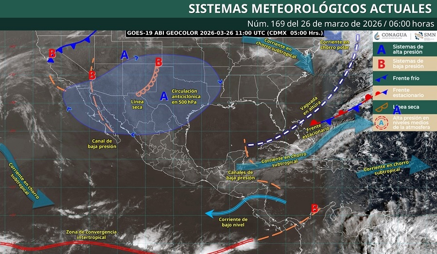 Este jueves 26 de marzo, el estado de Colima registrará lluvias aisladas y ambiente caluroso, de acuerdo con el pronóstico del Servicio Meteorológico Nacional (SMN). Canales de baja presión sobre el occidente del país, en combinación con el ingreso de humedad del océano Pacífico, favorecerán precipitaciones ligeras en la entidad, con acumulados de 0.1 a 5 milímetros.