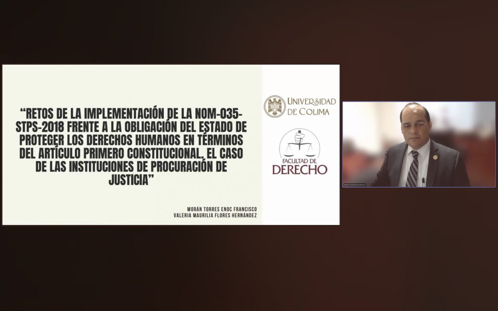 Este evento se realizó de manera híbrida. El profesor y la alumna de la UdeC participaron de manera virtual en la mesa “El panorama del Derecho del Trabajo: Retos y Reformas 2023”, con la ponencia titulada “Retos de la implementación de la NOM-035-STPS-2018, frente a la obligación del estado de proteger los Derechos Humanos en términos del artículo primero Constitucional. El caso de las instituciones de procuración de Justicia”.