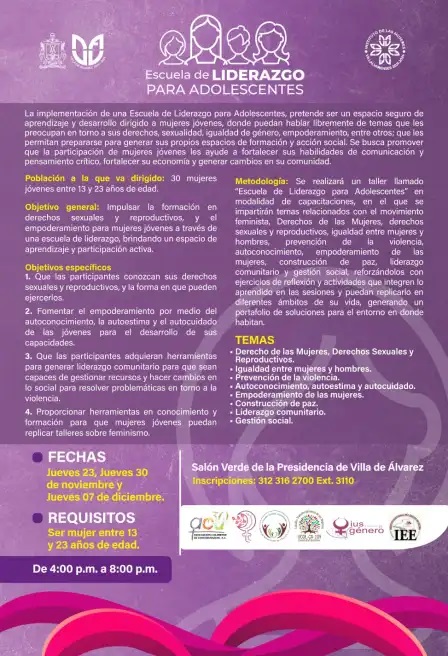 La Escuela de Liderazgo para Adolescentes, dirigida a mujeres de 17 a 20 años de edad, tendrá una duración de 3 semanas, y se estará impartiendo los jueves 23 y 30 de noviembre, así como el 7 de diciembre, en horario de 4 de la tarde a 8 de la noche, en el Salón Verde de la Presidencia Municipal de Villa de Álvarez.