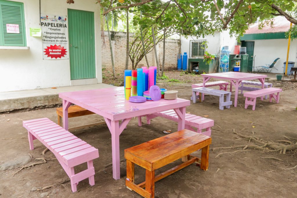 Coordinados por el maestro Daniel Mata y con el respaldo de la directora Esmeralda Morentín Ballesteros, las y los jóvenes de tres grupos construyeron y pintaron mesas y bancas utilizando tarimas de las que se emplean para cargar mercancías y que fueron a pedir a las empresas.