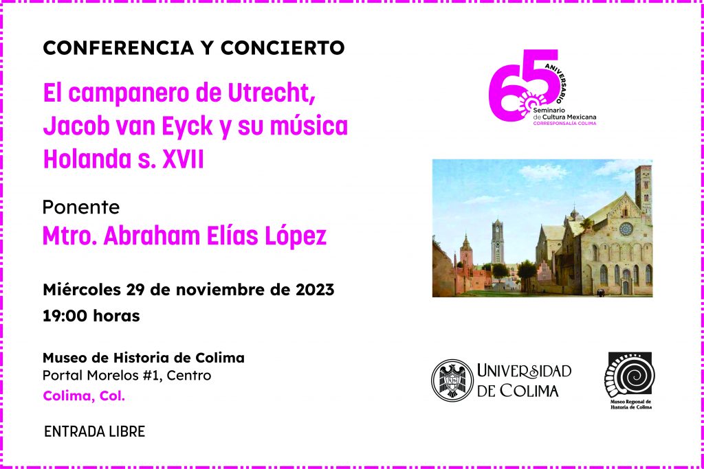 El Semanario de Cultura Corresponsalía Colima invita a la conferencia y concierto que ofrecerá el maestro Abraham Elías López, “El campanero de Utrecht, Jacob van Eyck y su música. Holanda s. XVII”, este miércoles 29 de noviembre, en la explanada del Museo Regional de Historia de Colima, ubicado en el Portal Morelos, en el centro de la capital, a las 7 de la tarde.