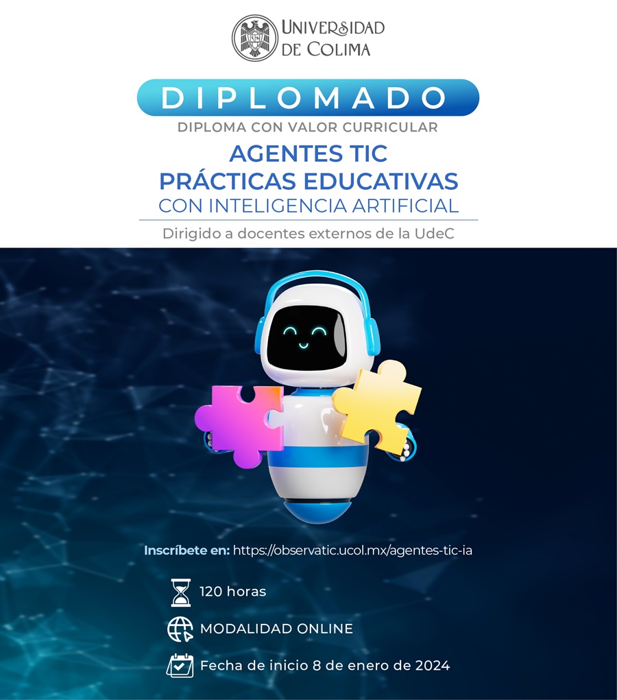 Desde el 23 de noviembre y hasta el próximo 13 de diciembre estarán abiertas las inscripciones al Diplomado Agentes TIC: Prácticas Educativas con Inteligencia Artificial, que organiza la Universidad de Colima a través de la Dirección General de Integración de las Tecnologías de Información (DGIDT).
