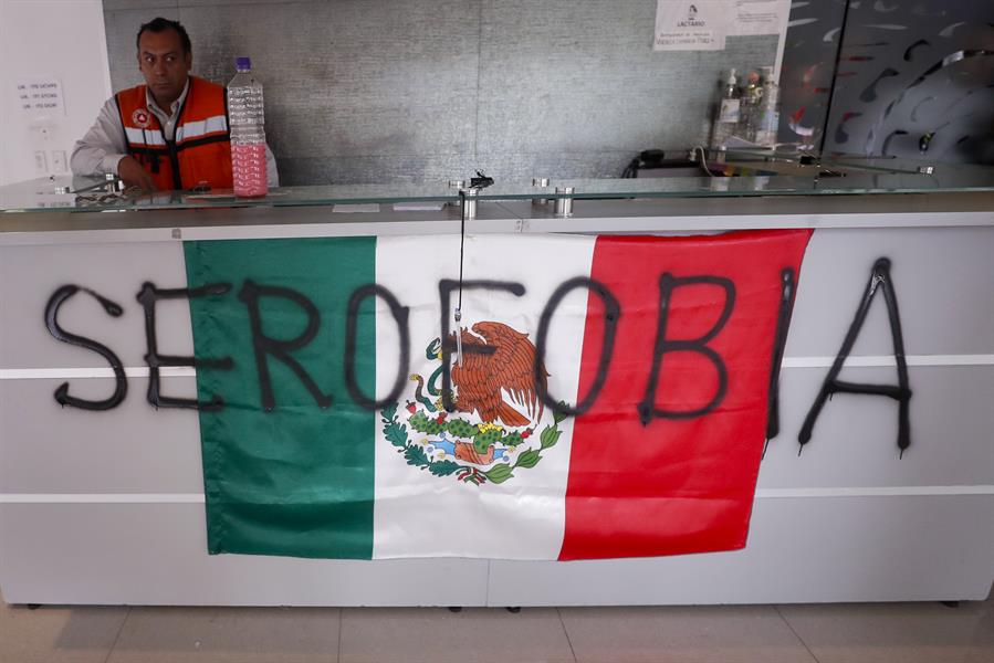 Convocados por la organización VIHve Libre, que ofrece apoyo comunitario a personas con el virus, una decena de asistentes lanzaron piedras contra el edificio, ubicado en la colonia Polanco de Ciudad de México, y pintaron sus cristales con proclamas como “El VIH no es un crimen” o “Mi vida no es un puto juego”.