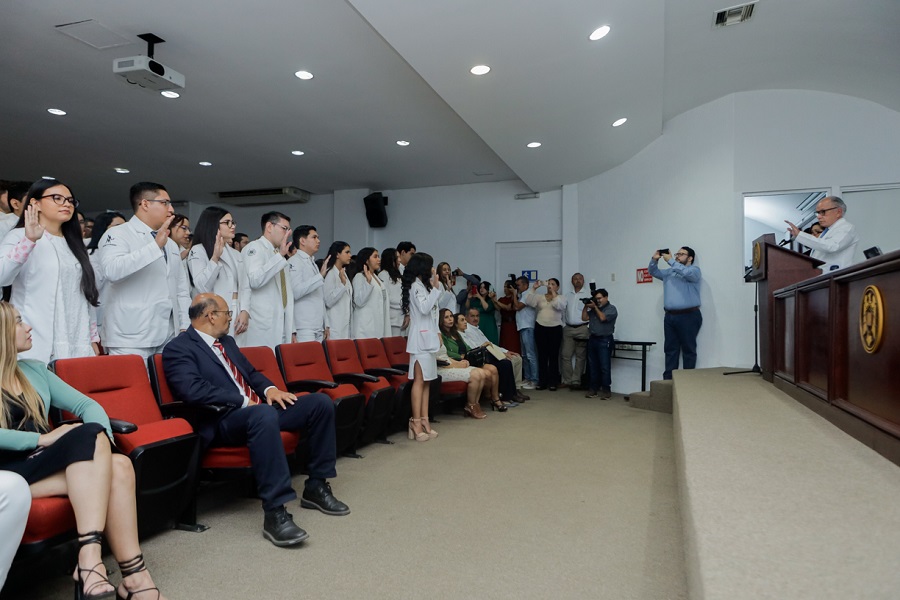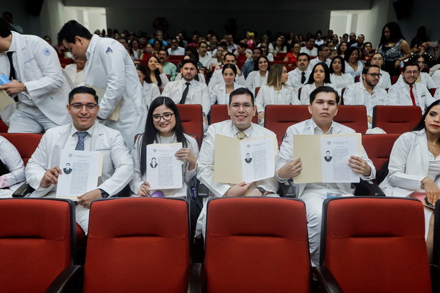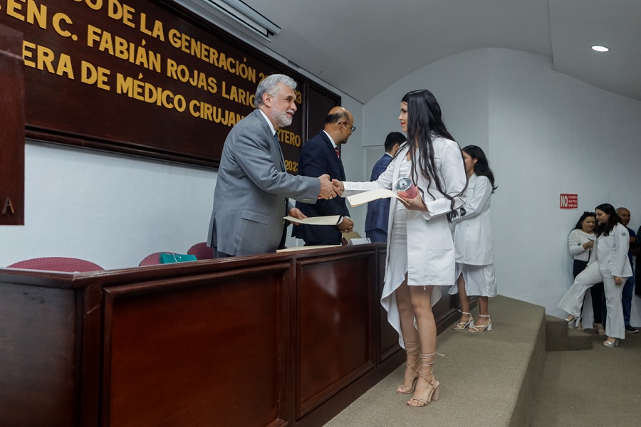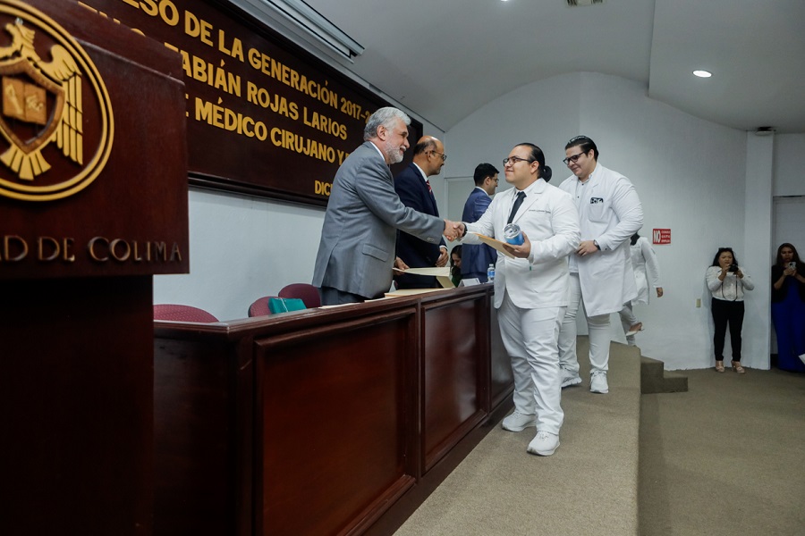 Destacó que es muy importante el trato respetuoso y considerado entre los pares que comparten la misma profesión, así como entre las y los maestros que han contribuido en su formación, y los felicitó “por este acto que los reconoce como médicos cirujanos y parteros, así como a sus padres, que han contribuido en su formación y a la propia UdeC”.