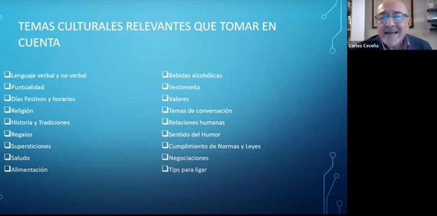 En este sentido, ofreció ejemplos del lenguaje verbal y no verbal, así como de la puntualidad que se tiene en los distintos países que ha visitado, sus días festivos y horarios, sus tradiciones y supersticiones. Incluso el saludo que tienen los mexicanos, comentó, es muy diferente al empleado en otros países.